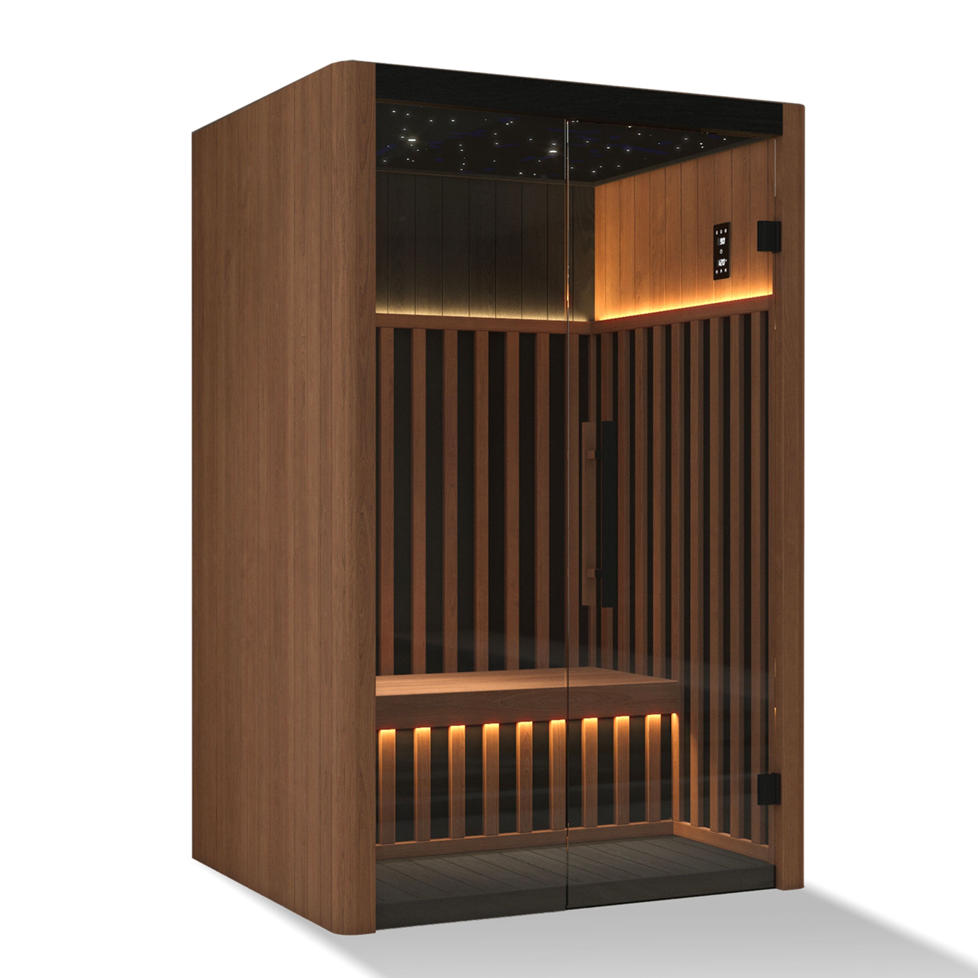 Mehr Platz für bequeme Sitzgelegenheiten zu zweit. Hochwertige Indoor-Infrarotsauna für 2 Personen aus der OKA Design-Linie, hergestellt aus thermisch modifiziertem Thermo Ayous-Holz und dunklem Thermo Abachi, mit einem modernen Infrarot-Heizsystem mit Nano-Carbon-Folie und IR-C-Strahlern mit einer Gesamtleistung von 2170 W. Die Sauna ist mit einer Sterndecke mit schwarzem Sockel, PTAT-Bedienfeld, Touch-Bedienfeld und WLAN-Verbindung über die Smart Life-Anwendung ausgestattet. Sie bietet eine komfortable Einzelbank, ergänzt durch eine Abdeckung mit Ambientebeleuchtung, eine dekorative Abdeckung der Heizpaneele mit integrierter Beleuchtung, eine schwarze Saunawachs-Beschichtung an den Außen- und Unterteilen, einen schwarzen Griff und Scharniere sowie ein dunkelgraues 6 mm dickes gehärtetes Glas.