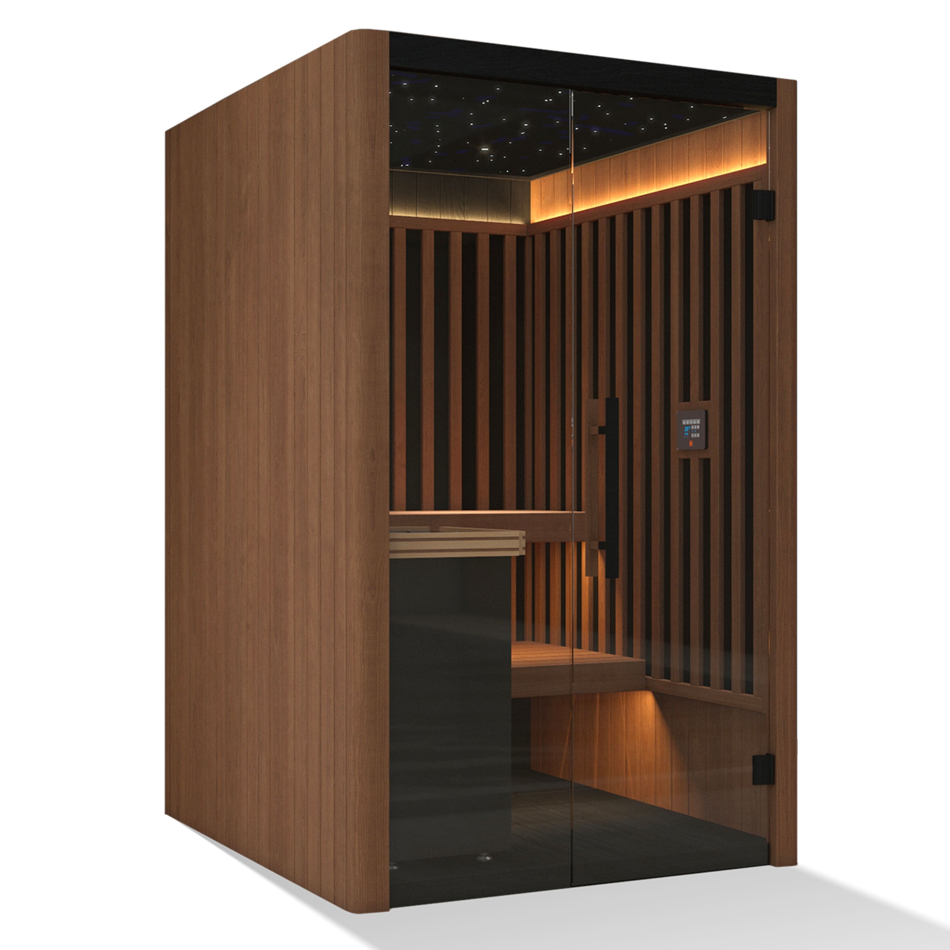 Kombination aus finnischer und Infrarotsauna aus der OKA Design-Reihe. Hergestellt aus dunklem Thermo-Abachi-Holz, ausgestattet mit einem elektrischen Saunaofen von HANSCRAFT mit intelligenter WLAN-Steuerung und einem modernen Infrarot-Heizsystem mit Nano-Carbon-Folie. Die Sauna verfügt über eine Sterndecke mit schwarzem Sockel, Ambientebeleuchtung, ein Lenden-Physiotherapiepaneel, eine bequeme Rückenlehne und ein komplettes Set an HANSCRAFT-Saunazubehör.