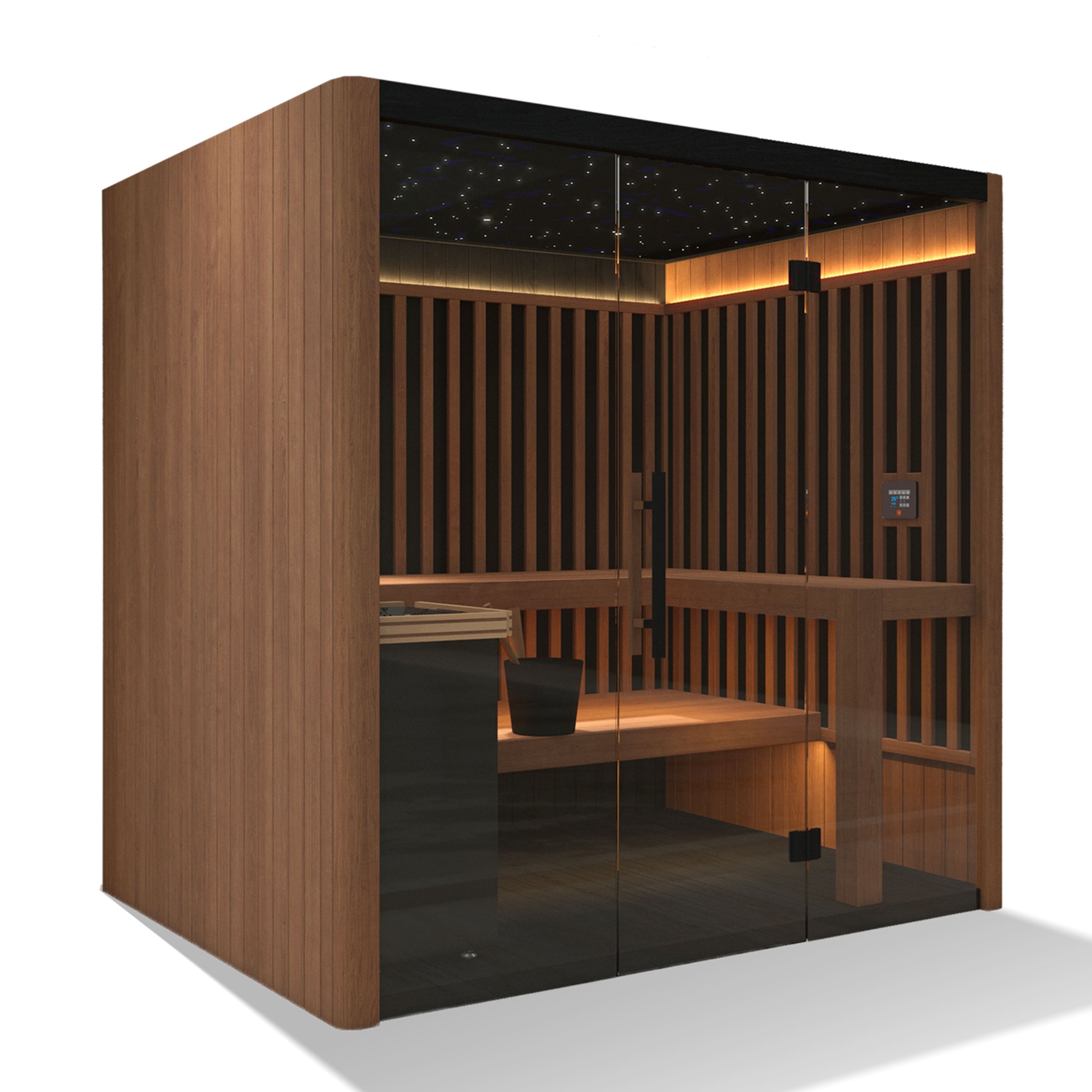 OKA FUSION SYNERGY 3 ist eine geräumige Sauna für 3 Personen mit den Maßen 210 x 160 x 208 cm, die für den Familiengebrauch und größere Räume gedacht ist. Mit zusätzlicher Breite und einer komfortableren Sitzanordnung ermöglicht es Entspannung in Gesellschaft mit einem rundum Wohlfühlerlebnis.