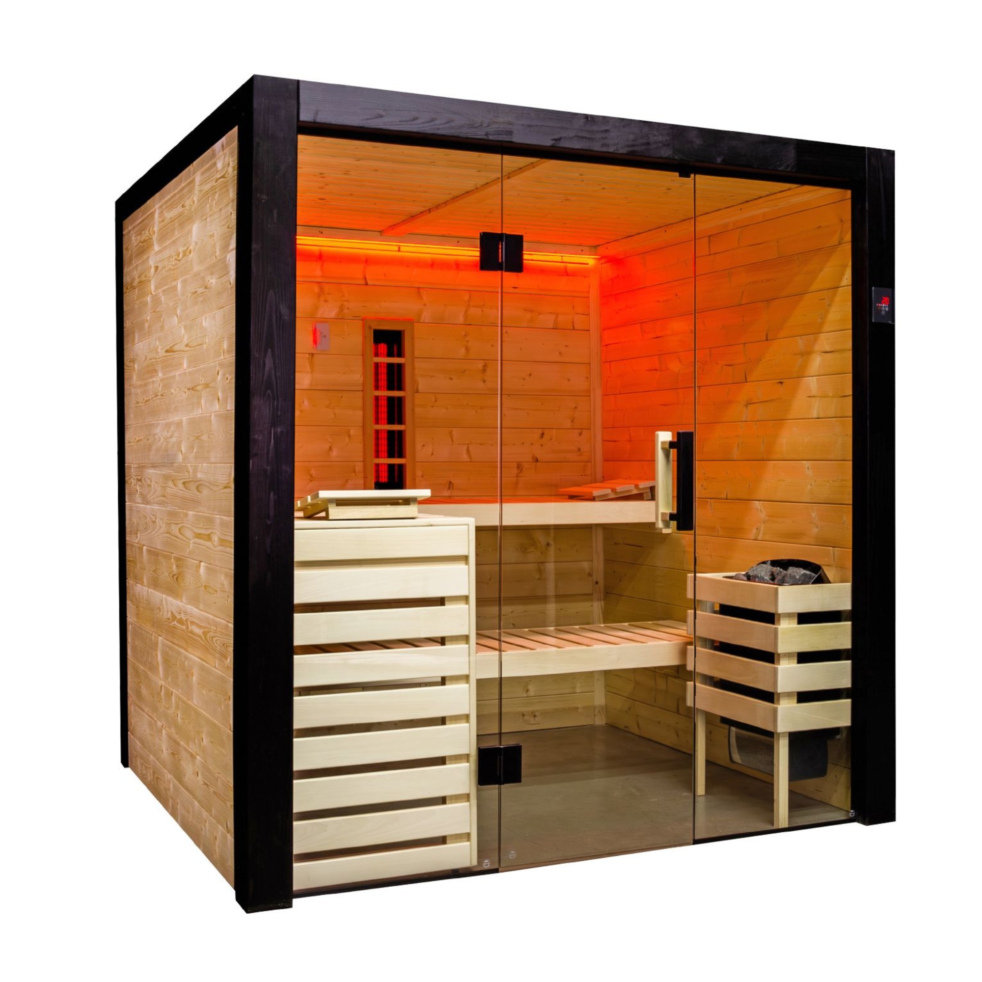 Ausgestattet mit der leistungsstarken Saunasteuerung Harvia PRO-D2I, dem Saunaofen Harvia 100 und den passenden Saunasteinen erleben Sie die perfekte Wärme und angenehme Atmosphäre. Ergänzt durch den Harvia VitaMy Infrarotstrahler können Sie die wohltuende Wirkung der Infrarotwärme für eine noch tiefere Entspannung genießen.